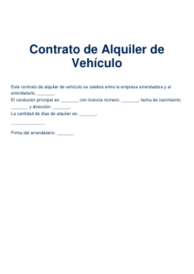 Absolutamente! Aquí tienes una descripción breve y concisa de un Contrato de Alquiler de Automóvil, en español, ideal para una página web: Contrato de Alquiler de Automóvil: Una Guía Rápida Un Contrato de Alquiler de Automóvil es un documento legal que formaliza el acuerdo entre una empresa de alquiler de coches y un cliente. Detalla los términos y condiciones del alquiler de un vehículo específico por un período determinado. ¿Por qué lo necesitamos? Claridad: Establece de manera clara las responsabilidades de ambas partes, evitando confusiones o malentendidos. Protección: Protege tanto a la empresa como al cliente en caso de daños, robos, accidentes o cualquier otro imprevisto. Seguridad: Define las políticas de la empresa respecto al uso del vehículo, las restricciones geográficas, el kilometraje permitido, etc. Legalidad: Sirve como prueba legal del acuerdo en caso de disputas. ¿Para qué sirve? Para asegurar que el cliente está informado sobre las tarifas, los cargos adicionales y las políticas de cancelación. Para garantizar que el cliente se compromete a devolver el vehículo en las mismas condiciones en que lo recibió (desgaste normal aparte). Para establecer los procedimientos a seguir en caso de emergencia o avería. Para regular el uso del vehículo, evitando su uso indebido o ilegal.
